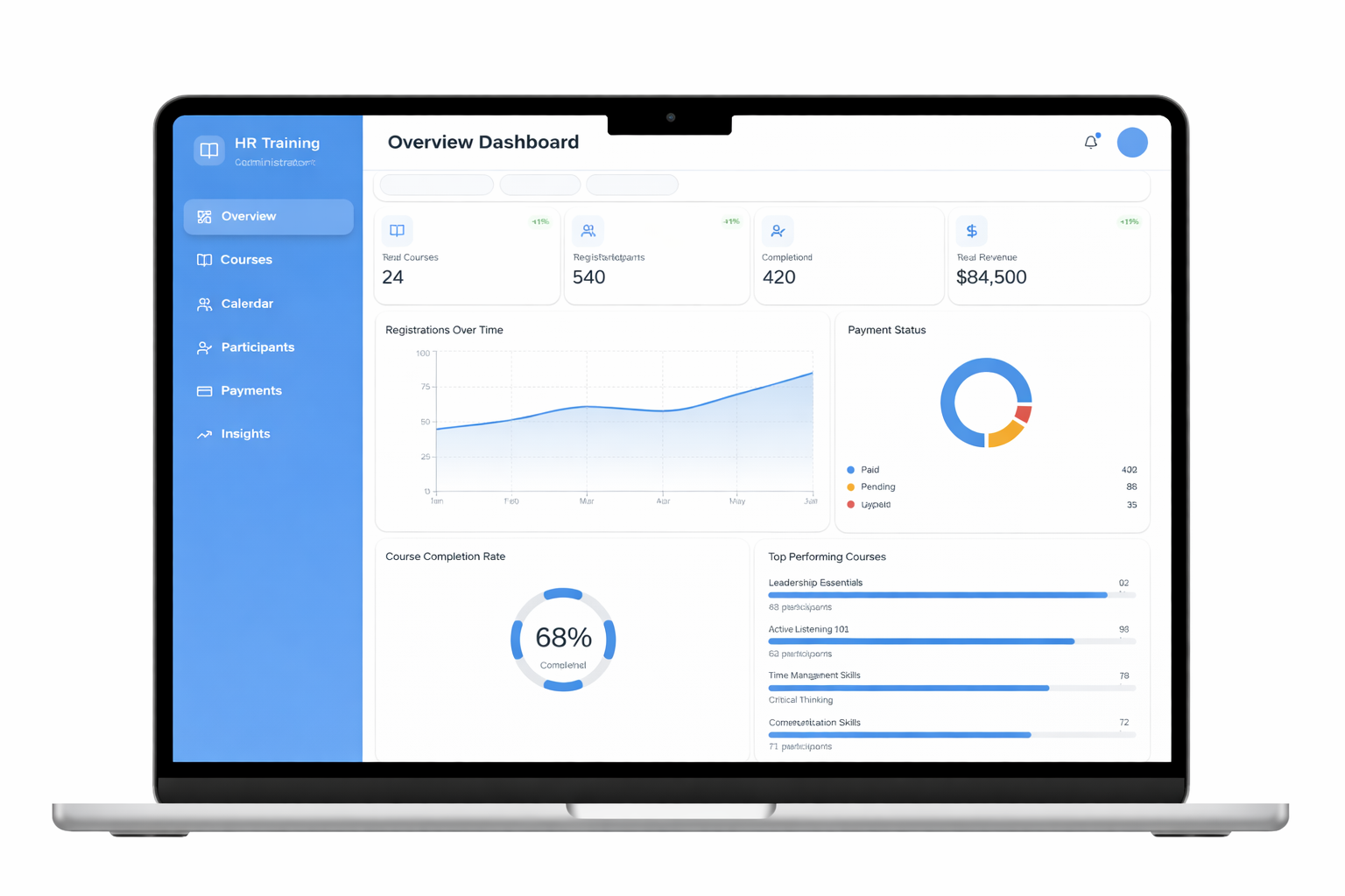 HR Training Dashboard provides a clear, centralized view of employee learning and training activities. It allows administrators to manage courses, cohorts, participants, and payments